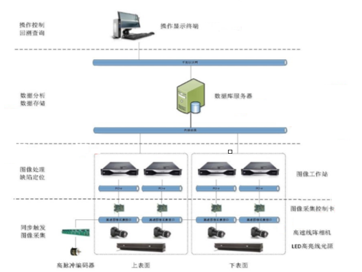 計算機系統通過數據庫來記錄和管理瑕疵的橫縱向位置、數量、大小和圖像等信息,同時可通過信號控制系統實現聲光報警等操作。